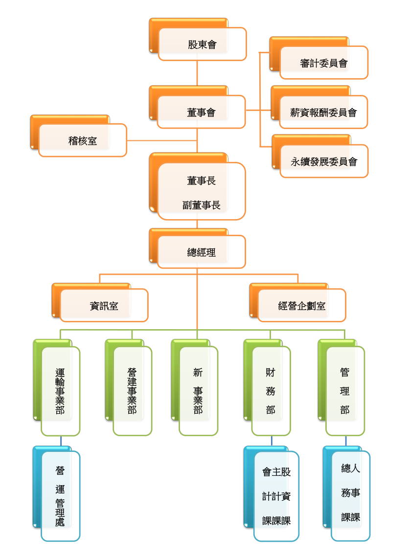 | 經營企劃室 | 職掌各項制度與規章之規劃、統制及經營之計劃、管理、分析、研究發展等之彙編、蒐集與報告;並協助公司治理業務運作及 執行;統籌公司永續發展、温室氣體盤查及確信相關事務。 |